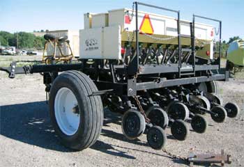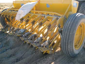 The rangeland drill was designed for seeding non-cultivated rangelands. It is a rugged, versatile implement for drilling in rough, rocky, or brushy areas. Many drills are configured with three seed boxes, grass (primary box), fluffy (shrub), and legume boxes. The grass and legume boxes are set to drop seed in the disk furrows, while the fluffy box tubes are typically removed so seed is deposited on the soil surface. The drills can be paired with a drill-cart to pull two drills at a time.