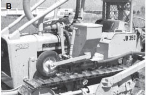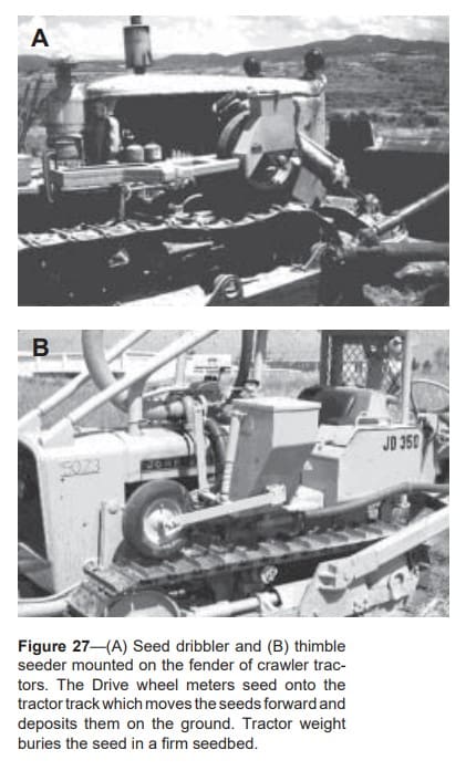 Seed dribblers are tractor-driven seeders and are mounted on one or both fenders. The drive wheel is positioned on the top of the track and driven by it. Seed is gravity fed, deposited on the tracks, carried forward, dropped on the soil and pressed into the soil. The tractor weight creates a firm seedbed and the track cleats create small water-catchment depressions. Dribblers are useful for planting species that require firm seedbeds or when seed is in short supply or costly. They are useful for planting shrub and forb seed separately from more rapidly growing grasses. They are also useful for small seeded species such as rabbitbrush, sagebrush, and many forbs that require minimal coverage. Dribblers can be used with other operations such as cabling.